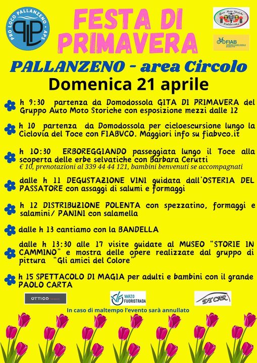 In occasione della Festa di Primavera, organizzata dalla PRO LOCO PALLANZENO APS, che si svolgerà a Pallanzeno domenica 21 aprile, FIAB VCO si è resa disponibile per accompagnare coloro che vogliono raggiungere l’area della festa in bicicletta.