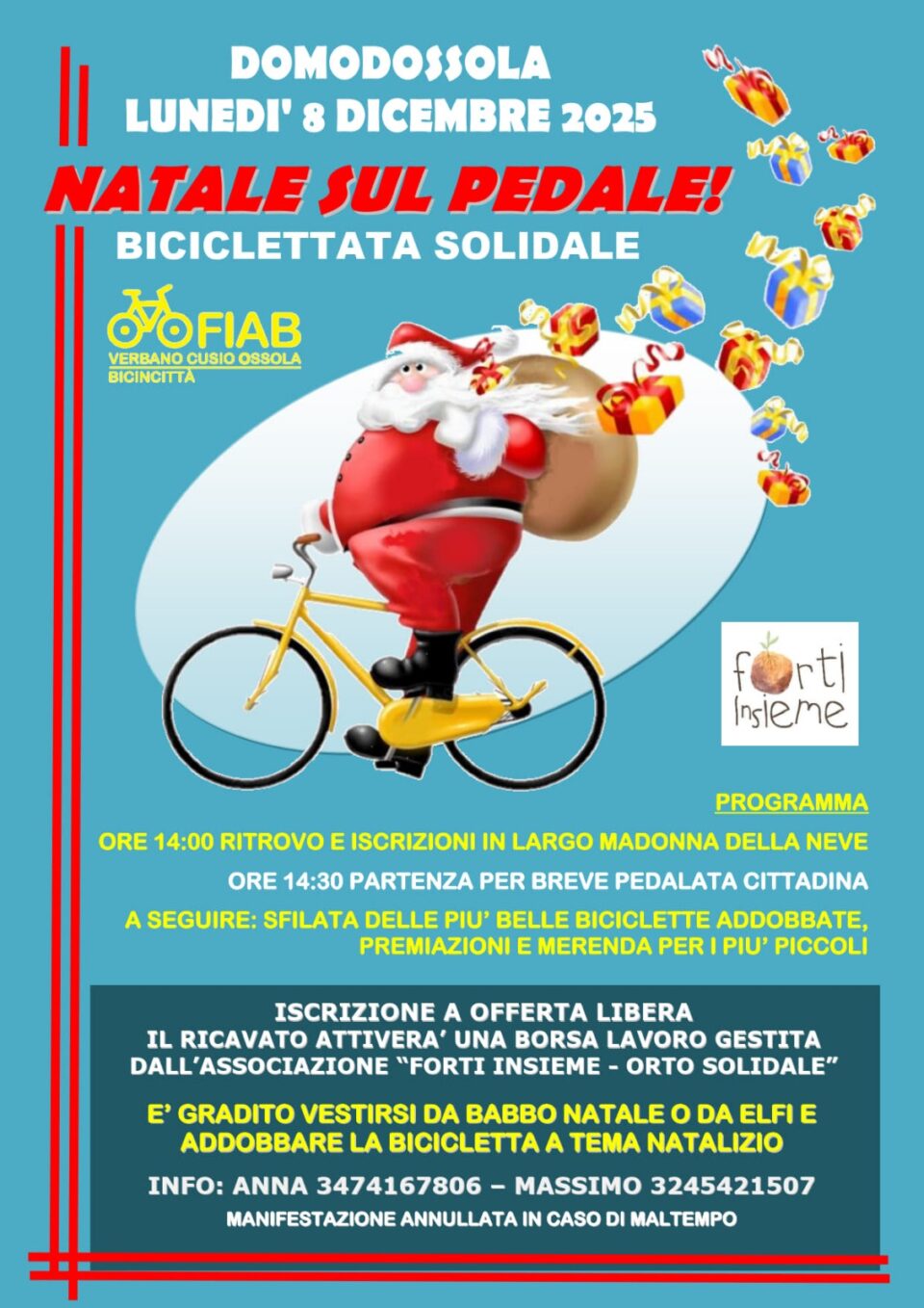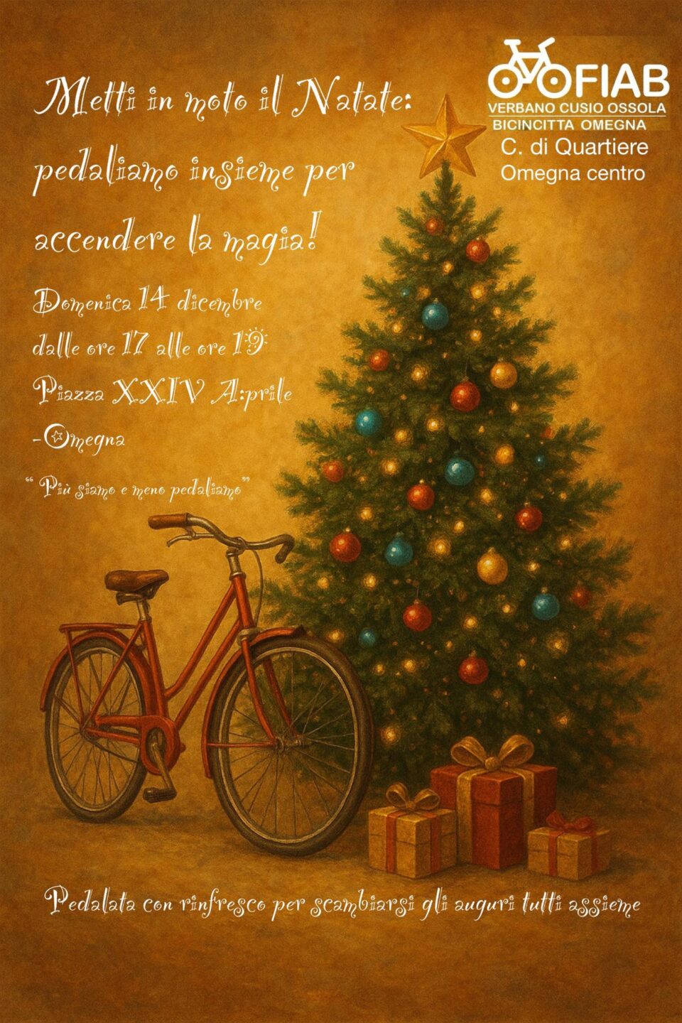 FIAB VCO propone due iniziative “natalizie” (lunedì 8 a Domodossola e domenica 14 a Omegna) per condividere la passione per la bicicletta e scambiarci gli auguri per le imminenti feste. Vi aspettiamo numerosi e coloratissimi!